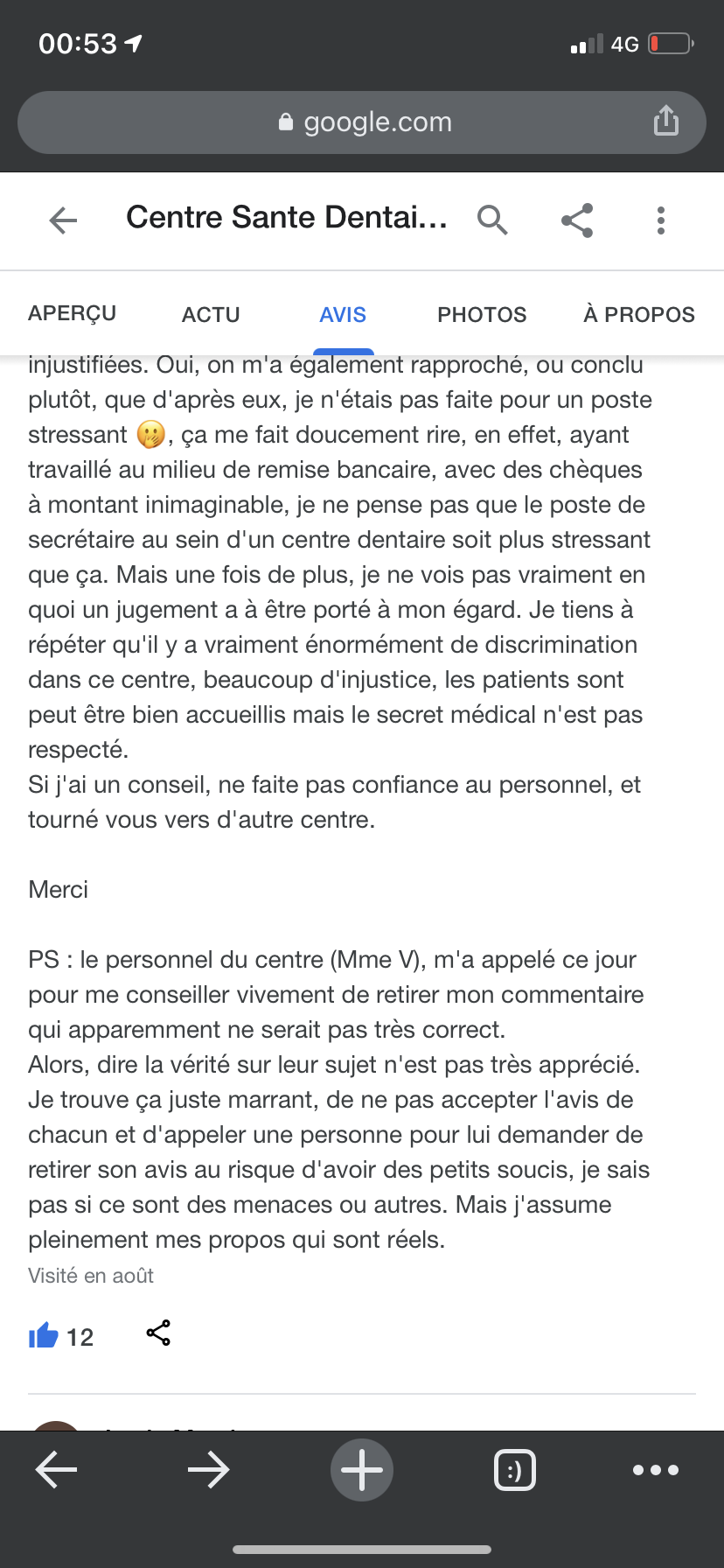 Alors, j'ai été amené à travailler dans ce centre dentaire, par où commencer. De mon côté, tout s'est très bien passé pendant mes 《3jours de formation》apparement pas pour la direction. J'ai pu constater qu'il y avait un gros manque de professionnalisme, et énormément mais vraiment énormément de différences. Nous sommes là, dans un centre dirigé par un couple et leur fille âgée de 21ans. Il y a énormément de discrimination envers le reste du personnel(on exclu la fille évidemment)... c'est vraiment flagrant. Mme la responsable me reçois dans son bureau pour faire un petit point, qui fut très positif, le lendemain soir, après ma journée de travail, forcément, m'ont fait signer les documents, donc contrat de travail ect, pour ensuite m'annoncer en finesse que je partais immédiatement. Très bien, aucune raison n'a été mentionné, et le peu de parole apporté ont étés injustifiées. Oui, on m'a également rapproché, ou conclu plutôt, que d'après eux, je n'étais pas faite pour un poste stressant 🤭, ça me fait doucement rire, en effet, ayant travaillé au milieu de remise bancaire, avec des chèques à montant inimaginable, je ne pense pas que le poste de secrétaire au sein d'un centre dentaire soit plus stressant que ça. Mais une fois de plus, je ne vois pas vraiment en quoi un jugement a à être porté à mon égard. Je tiens à répéter qu'il y a vraiment énormément de discrimination dans ce centre, beaucoup d'injustice, les patients sont peut être bien accueillis mais le secret médical n'est pas respecté. Si j'ai un conseil, ne faite pas confiance au personnel, et tourné vous vers d'autre centre. Merci PS : le personnel du centre (Mme V), m'a appelé ce jour pour me conseiller vivement de retirer mon commentaire qui apparemment ne serait pas très correct. Alors, dire la vérité sur leur sujet n'est pas très apprécié. Je trouve ça juste marrant, de ne pas accepter l'avis de chacun et d'appeler une personne pour lui demander de retirer son avis au risque d'avoir des petits soucis, je sais pas si ce sont des menaces ou autres. Mais j'assume pleinement mes propos qui sont réels.