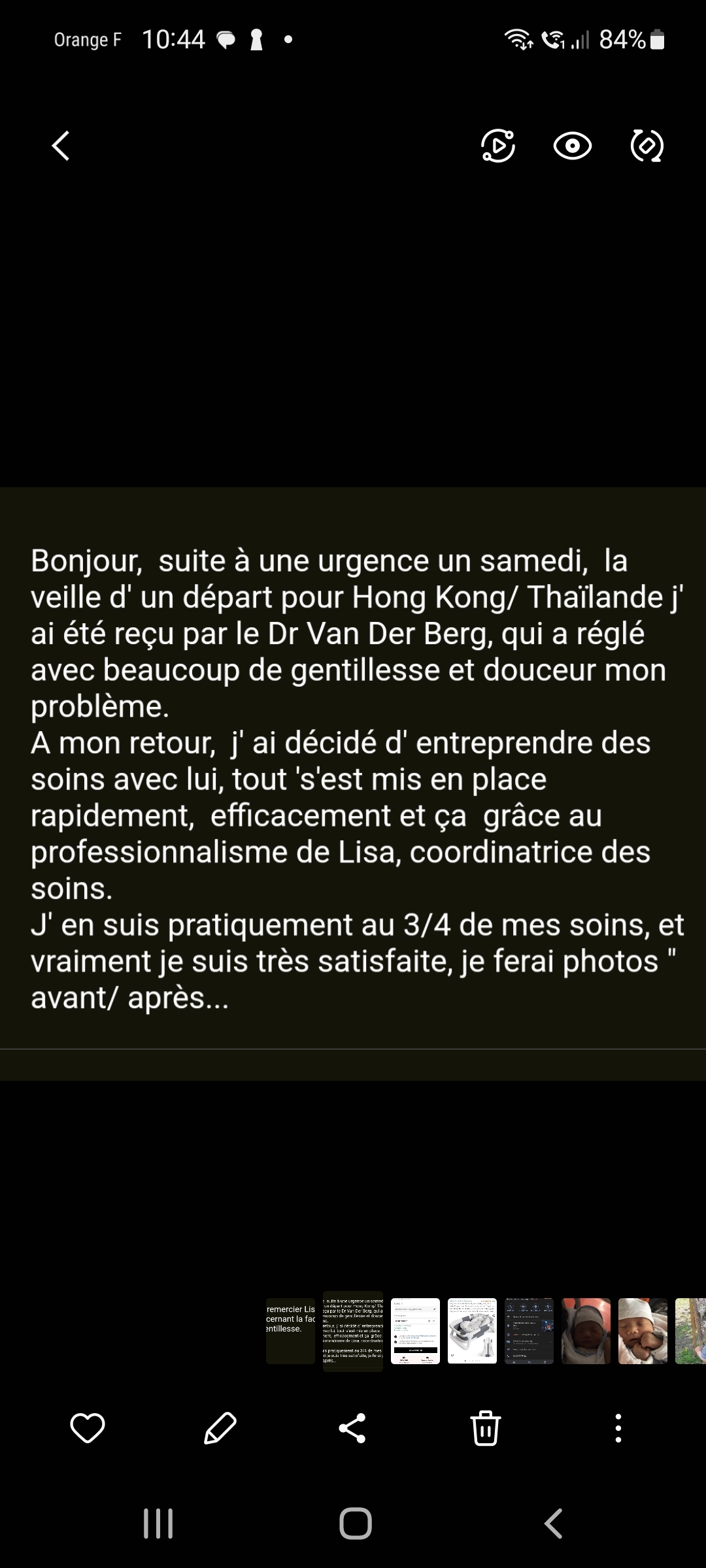 Que dire sinon que ce rendez vous a été au top! Pris en avance tout le monde était souriant ! La qualité des soins était formidable et les conseils plus que justifiés et bien venus! Bref merci a toutes l équipe et un gros bisoux au docteur et a son assistante!