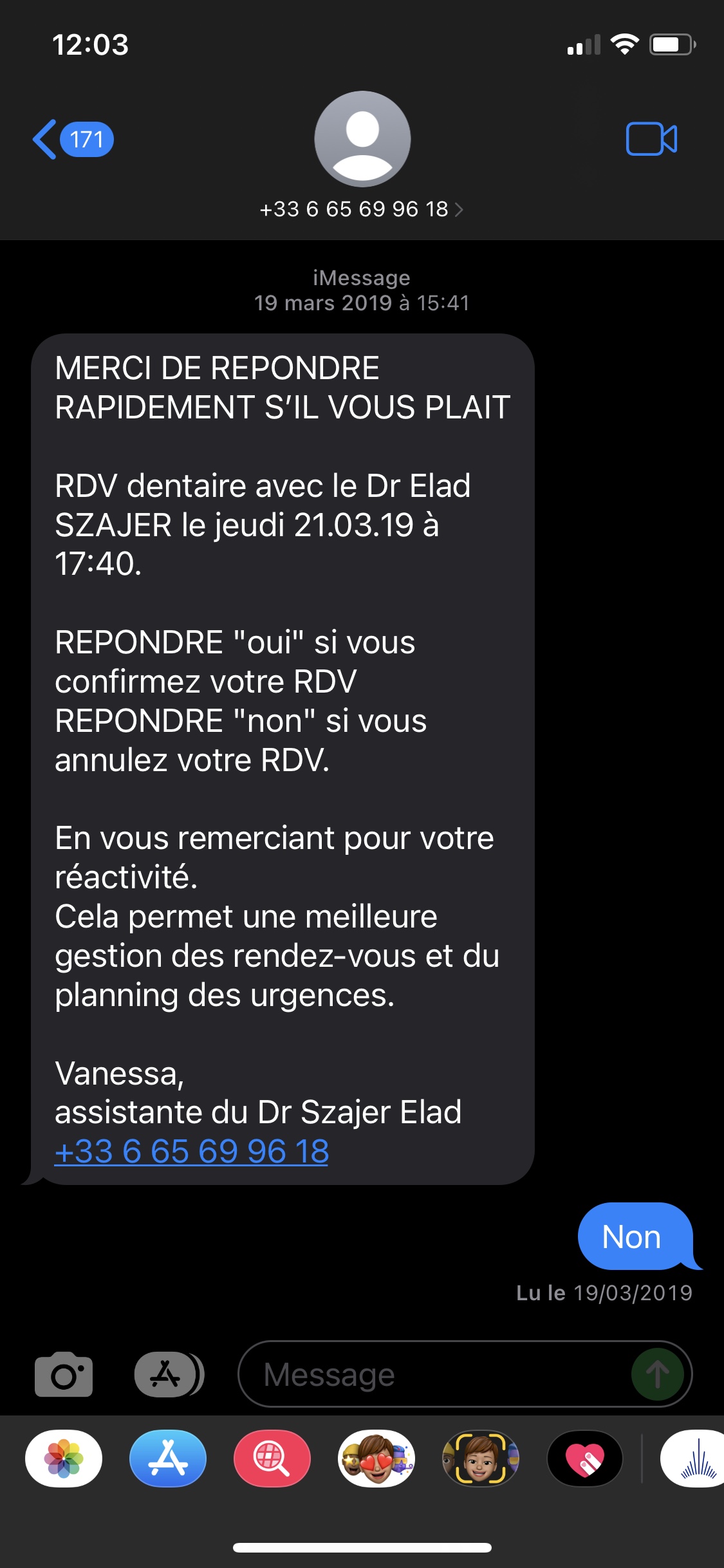 Finalement sms du praticien ce jour 12/04 : Le rdv est maintenu et l'erreur serait imputable au secrétariat 1 er RDV Le 2 mars pour contrôle. Panoramique dentaire effectué RAS fin de rdv avec prescription d'un traitement de parodontologie. Visite non facturée. Pour raisons familiales je quitte la France précipitamment le 9 mars. A la descente d'avion douleur dans la gencive, le lendemain abcès. Je consulte sur place, le praticien tente de sauver la dent ; en vain. 10 jours plus tard extraction de la dent + couture de la gencive. Retour en France, prise de RDV auprès du cabinet pour le 12/04 via l'applicatif en ligne Mon docteur. Confirmation par sms du RDV. Le lendemain ; message du cabinet : l'applicatif n'est pas à jour votre rdv est annulé !!!! première disponibilité le 23/04 ? je reformule ma demande : que les fils mes vient otés ce qui doit prendre moins de 5 minutes montre en mains. REFUS Bilan : applicatif numérique HS - FERMEZ LE Prise en charge du patient : je vous laisse apprécier........