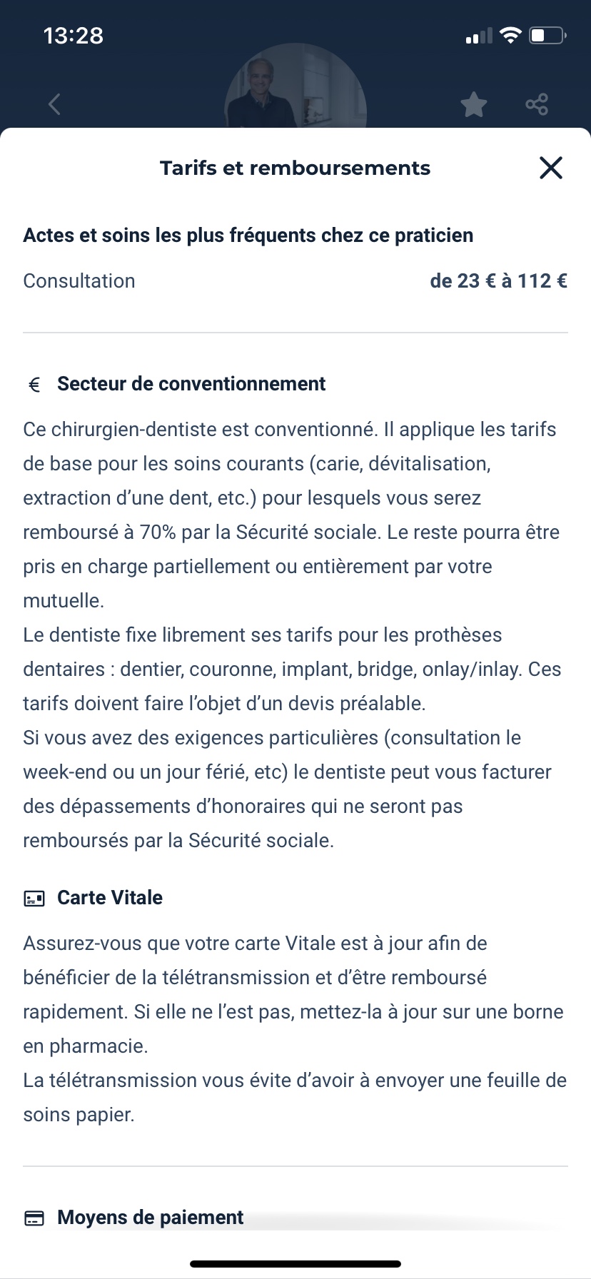 D'après Doctolib ce médecin est conventionné ce qui veut dire qu'il devrait facturer « les tarifs de base pour les soins courants » mais quand j'y suis allé on m'a dit que ça coûterait ~ 120 euros pour faire juste un contrôle normal et si je n'avais rien mauvais alors ça n'avait probablement pas de sens pour moi de me faire plaisir là-bas Je mets 3 étoiles (au lieu de 1) car je trouve que c'est très honnête de leur part de m'avoir dit au préalable que cela n'en valait probablement pas la peine si je voulais seulement un contrôle régulier. Alors je suis parti Mais aussi mettre 3 départs car Doctolib dit que c'est conventionnel juste pour la consultation et les choses normales comme « Carie, dévitalisation, extraction d'une dent » donc je ne comprends pas comment alors ils m'auraient facturé plus de 100 euros alors que le contrôle normal est genre 23 euros