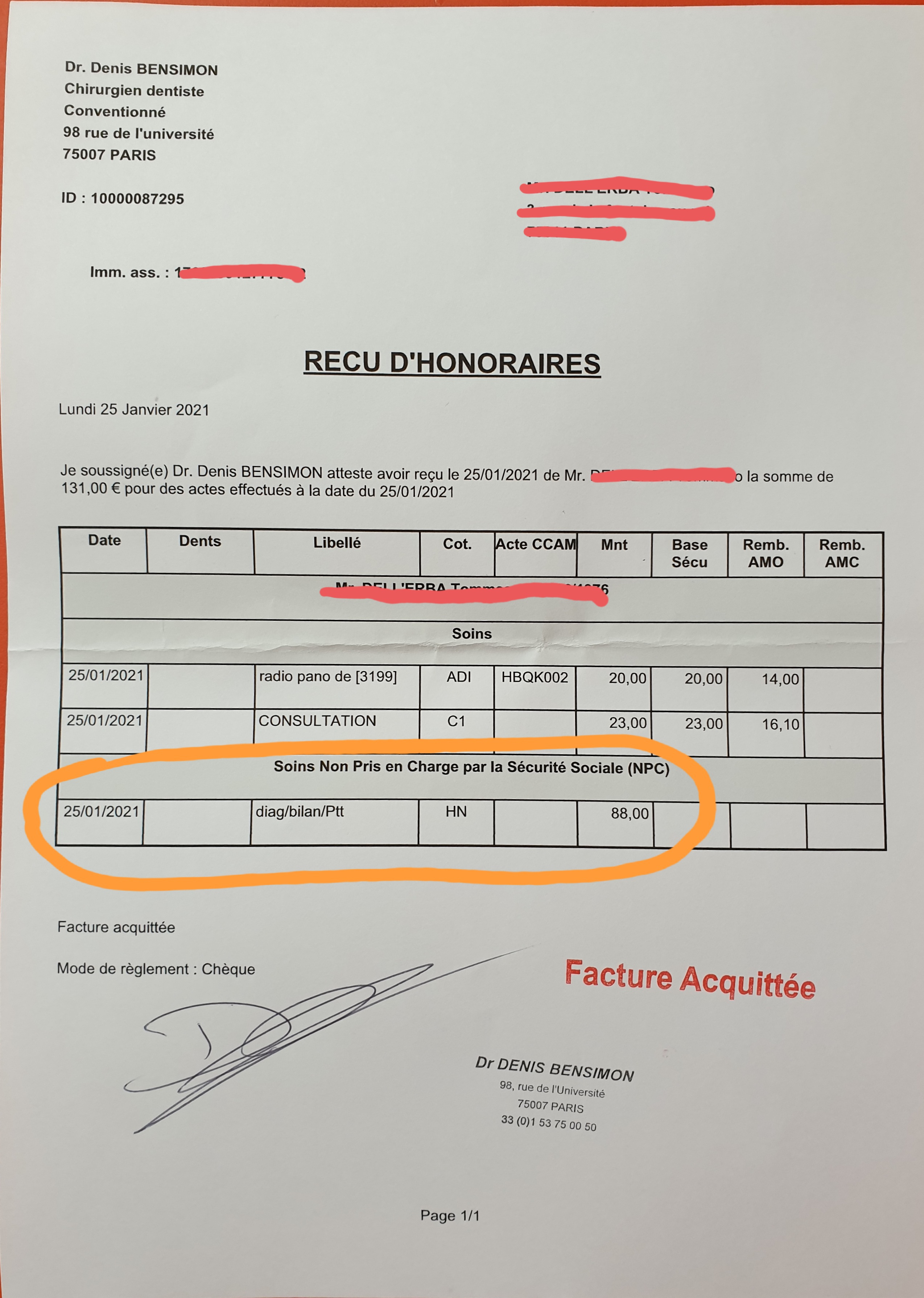D'après votre réponse, je doute que vous avez compris le motif de ma réaction: VOUS DEVEZ INFORMER VOTRE CLIENT DE TOUT DEPASSEMENT. ET VOUS NE L'AVEZ PAS FAIT. Et oui: cela fait partie de la Déontologie, l'ensemble des règles et devoirs régissant une profession. Et il faut s'y tenir. Votre réponse commence avec un contre-attaque infantile à mon message qui n'était pas du tout offensif, mais factuel. Puis vous dites avoir faits vos examens et répondu à mes réponses: certes, aucun doute là-dessus. C'est ce que j'ai écris moi même dans mon message. Le problème c'est qu'à aucun moment vous m'avez informé que cela aurait entrainé des surcouts. Il n'y a aucun problème avec vos dépassements, c'est le manque de transparence qui est critiquée. Je suis venu pour une consultation prise en charge par la sécurité sociale et je me retrouve avec un surcout de 88€ pas pris en charge: eh oui, pas 88€ au lieu de 79€ comme vous dites, mais 88€ non prises en charge en plus de la consultation et de la radio (regarder la facture ci-jointe) ICI LE MESSAGE INITIALE AVEC LE DETAIL DE CE QU'IL S'EST PASSÉ: Mauvaise surprise au moment de la facture !!! Client non informé des dépassements d'honoraires. Ici l'histoire: Malgré la gentillesse du docteur et de son service de réception, il y a une chose que je trouve déontologiquement non correcte. Je me suis rendu dans son cabinet avec un RDV Doctolib pour une consultation afin de recevoir un devis pour soigner une carie (ce que j'avais pris soin de marquer dans les notes du RDV sur le site de Doctolib). Pendant le RDV le docteur m'a pris une panoramique et il m'a gentiment posé des questions qui sortaient du cadre de la simple carie. On a discuté de possible orthodontie Invisalign et je pensais que cela faisait partie de la consultation. Au moment de payer, la gentille dame de la réception me demande 130 euros. Je regarde bien la note d'honoraires et il y a trois lignes: une consultation au tarif de la SS, une panoramique au tarif de la SS et un diagnostic à 88 euros non pris en charge par la SS, donc non remboursé non plus par la majorité des mutuelles. Pourquoi je trouve cela déontologiquement non correcte? Car à aucun moment le docteur m'a demandé: cher patient, voulez-vous que je vous fasse un diagnostic complet qui vous coute XXX et qui sort du cadre de la consultation prévue ? A aucun moment il m'a parlé de dépassement d'honoraires. Sur Doctolib il est marqué que : En cas de dépassement des tarifs, le praticien doit en avertir préalablement le patient. Comment peut-on se rendre compte que les questions du docteur sortaient du cadre de la simple consultation? Et cela sans informer préalablement le patient (ou le client) comme définit par la loi. Je suggère au docteur plus de transparence.